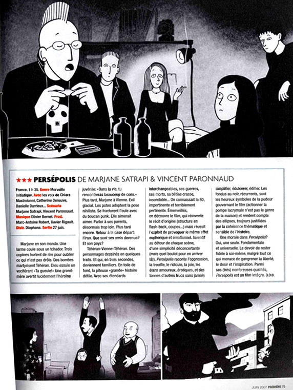 Marjane Satrapi and Vincent Paronnaud' film Persepolis is out for national release in France today June 27th 2007. The French Press unanimously hails the Cannes Jury Prize film as a masterpiece in its genre and see is not as animated cartoon but a film in its own right. [Trailers: 1 -- 2 -- 3 -- 4] From the Right Wing newspaper Le Figaro, to Left Wing Humanite and Liberation or Centrist Le Monde and last but not least Royalist (aka Monarchist and not to do with Segolène) Point de Vue Images Du Monde magazine ALL recognize the movie's qualities in breaking down stereotypes on Iranians and Iran and for its style that is inspired from Italian neo Realism to German Expressionist Cinema. The film is meant to become a summer blockbuster has already its aficianados amongst the comic book fans worldwide ever since the publication and translation of Marjane Satrapi's personal account of her experiences growing up in post Revolution Iran and in exile in Austria and France. VIVE LE CINEMA! Comment
