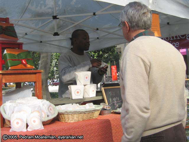 Downtown Los Angeles isn't exactly known as a pedestrian destination. That is slowly changing though with more people moving back to the area and new developments changing the harsh dual landscape of skyscrapers and run-down retail areas. The Wednesday farmer's market in front of city's main library is an example of this change. Originally started last summer for a short trial and now twice extended to an indefinite number of weeks, it is where the lunch-time suits meet the area locals to buy everything from organic produce, fresh cut flowers, baked goods, hand-made jewelry and even a quick lunch at a half dozen stands. Right in the midst of speeding cars and tall buildings, this is one place to seek out the warmth of ordinary Angelinos. -- Pedram Moallemian , Eyeranian.net
