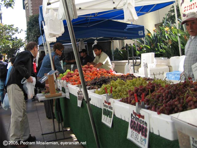 Downtown Los Angeles isn't exactly known as a pedestrian destination. That is slowly changing though with more people moving back to the area and new developments changing the harsh dual landscape of skyscrapers and run-down retail areas. The Wednesday farmer's market in front of city's main library is an example of this change. Originally started last summer for a short trial and now twice extended to an indefinite number of weeks, it is where the lunch-time suits meet the area locals to buy everything from organic produce, fresh cut flowers, baked goods, hand-made jewelry and even a quick lunch at a half dozen stands. Right in the midst of speeding cars and tall buildings, this is one place to seek out the warmth of ordinary Angelinos. -- Pedram Moallemian , Eyeranian.net