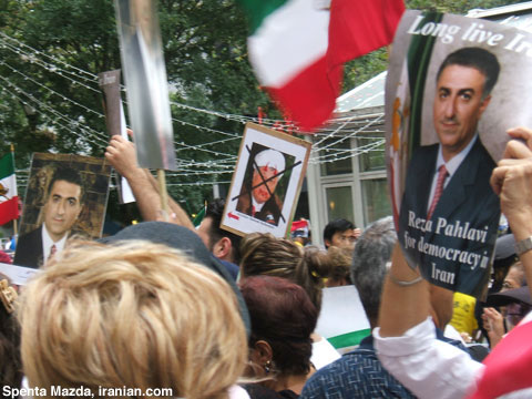 The Republican section was awash with pictures and T-shirts of the Rajavis, as families mingled alongside cruising teens looking for hookups. Monarchists were splitting the front (facing 1st Ave and the UN) with MKO, and 2 dozen meditating Falon Gung practitioners from China. The Mojaheds used to get more people at their protests years ago, although they pulled together an impressively sizable group for the protests against Antareenejad at the UN today.