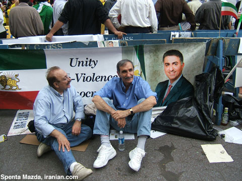 The Republican section was awash with pictures and T-shirts of the Rajavis, as families mingled alongside cruising teens looking for hookups. Monarchists were splitting the front (facing 1st Ave and the UN) with MKO, and 2 dozen meditating Falon Gung practitioners from China. The Mojaheds used to get more people at their protests years ago, although they pulled together an impressively sizable group for the protests against Antareenejad at the UN today.