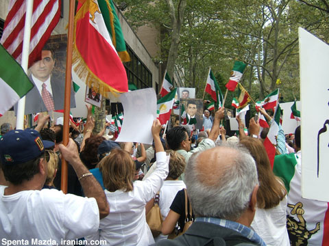 The Republican section was awash with pictures and T-shirts of the Rajavis, as families mingled alongside cruising teens looking for hookups. Monarchists were splitting the front (facing 1st Ave and the UN) with MKO, and 2 dozen meditating Falon Gung practitioners from China. The Mojaheds used to get more people at their protests years ago, although they pulled together an impressively sizable group for the protests against Antareenejad at the UN today.