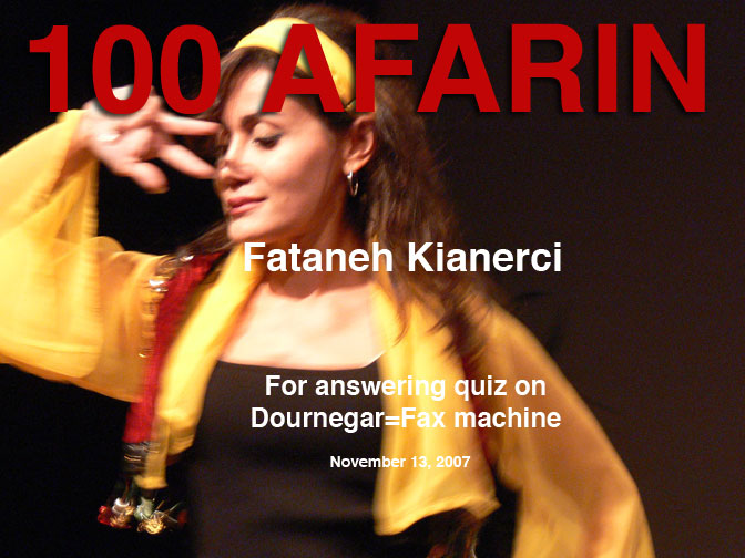 by seriously??? (not verified) on Thu Nov 15, 2007 10:40 PM PSTThat's ridiculous...everyone knows fax machine in farsi is "faks masheen", as in the sentence..."een madrak ra ba faks masheen befrest..." where did you guys come up with this nonesense?? Probably while eating a piece of kesh loghmeh (pizza) and searching on your rayaneh (computer) for chert o pert like this!!!