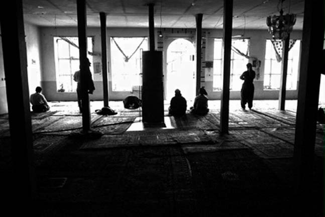 in the court of a private home. Following an initial prayer, men sat on the floor,