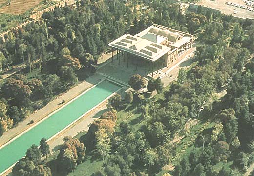 Aerial photo of Chehel-Sotun, Isfahan: The British art historian Robert Byron saw [Chehel-Sotun] brought to life during the 1933 trip that led to his classic travel memoir, The Road to Oxiana. At a reception to honor the Shah's birthday, he said, the building became the stately pleasure dome that had been intended. "Spread with carpets, lit with pyramids of lamps, and filled with several hundred people, the veranda looked enormous; its wooden pillars and painted canopy towered away into the night; the glass niche at the back, glittering through its gold filigree, seemed infinitely distant." There was dancing in the long vaulted room beneath the frescoes, and then fireworks outside, pouring streams of gold into the black water of the reflecting pool. Even Byron, an eccentric and often acerbic man, was enchanted. Not everyone, he wrote, could say he had danced in the Chehel-Sotun. (p. 96) "All is calm": Persian garden main index From The