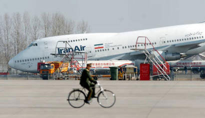 A Chinese policeman rides his bicycle past an Iran Air passenger