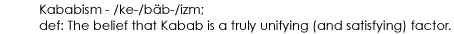 And finally, Ah yes! Fundamentalist Islam! Jesus, there's so much, , where do I start? At last count there are no less than 14 designs for the hejab, roosari, manteau, burka, chador or whatever you want to call this oppressive symbol of the year. (You don't believe me? Then visit //www.islamicsuperstore.net/hejabs.htm) And can somebody 'splain this to Tony, where in the Ghoran does it say that it's an actual veil of cloth? I thought it was a metaphorical veil of purity that a woman should enshroud herself with, to hold her head up proudly and command respect for being the life giver and life nurturer. Given the lawlessness, and "looseness" of the Arab world at the time, it made sense. Walking around in a sack just might be a bit off! Everyone these days seems to be saying; "Look at how royal my turban makes me look! I'm a Sikh! Ha! Ha! Ha!" "Look at my fish bumpersticker, I'm the studly Christian tripple threat, I qualify for automatic redemption, indemnification and forgiveness. Nanny-Nanny Boo-Boo!" "Look at my custom croche'd yamulka I'm a Jew baby! I'm one of the few, the proud, the chosen! Kenef!" "Check out the flowing robe Bra' (and Hoo! Hoo! I'm not wearing pants)! I'm a Buddhist! Aren't I cool!" "Look at me, I'm a white girl from Jersey, I may be butt ugly and 45 pounds overweight, but I'm wearing a hejab and no makeup, because I (and my abusive husband) really want to! Rock On!" "Look at me!" "Look at me!" " L O O K A T M E ! ! ! " I thought one of the main tenets of all these religions was humility, that you weren't supposed to brag about it? I mean if God knows and sees everything, He doesn't factor you wearing all the religious decoration now does She? Here's one more: each religion teaches about one true God (theirs of course), but completely discounts the the next religion, branding it as optional but always illegitimate, never equal. They state right to your face that theirs is the one true religion. HELLO???? HOW CAN THAT BE? So, you can see I've pretty much got no faith in any of these organized religions anymore. As a true student, of course I blame The Administration, for having ruined it for everybody. So I give up. I give up! You know, Aslan, I have a better idea, I'll start my own religion. Keep it simple and make it accessible so it doesn't threaten anyone. But I need a gimmick, I need an angle, I need some kind of adhesive. Let's see, what's always good and never evil...(you know I'm kind of hungry...I could really go for some...Wait! That's it!) Introducing: Here are the basic tenets of the Kababist faith. (Oh and by the way if you think you'd like to join after reading this, no problem, you're in! You can also leave whenever you want to! Membership, unlike in the other religions, is not the point here.)