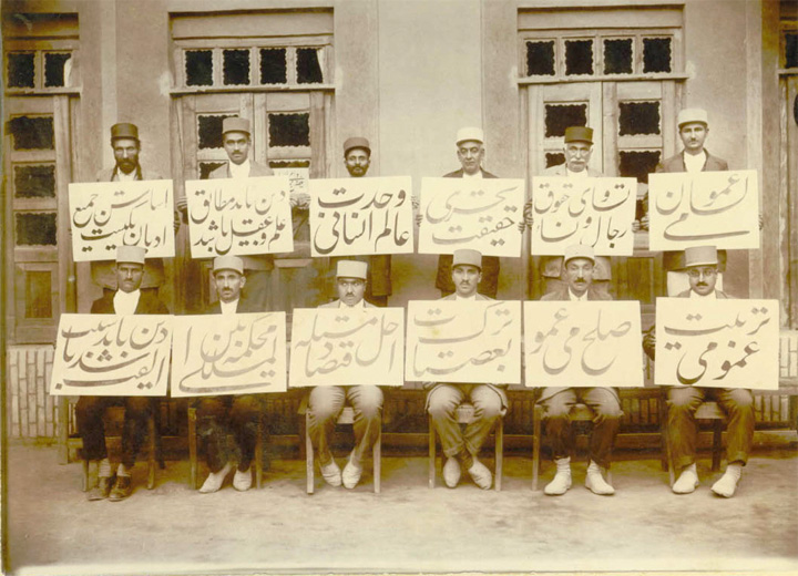 1930s: A group of Bahais from Yazd holding signs with principles of their faith. What does the circled one say? DEEN BAAYAD SABABE OLFAT BAASHAD (faith should bring about harmony) >>> LARGER IMAGE