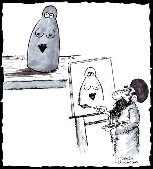 by Multiple Personality Disorder on Sat Jan 24, 2009 09:11 PM PSTThe mullah, based on his religion belief, can not directly look at a woman who is naamahram to him, which is why he is standing behind the canvas that blocks his view of the female model. That is why he has drawn her vagina too high, painted where her belly button is supposed to be.